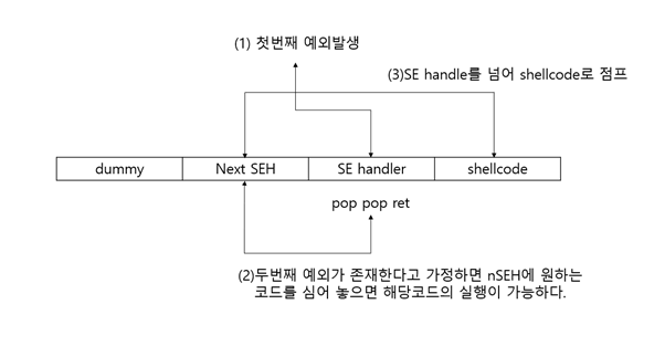 SEH 기반 취약점에서, 공격자의 junk 페이로드가 nSEH 포인터 주소를 덮어쓴 다음, SE 핸들러를 덮어쓴다. 그 다음 위치에 쉘코드를 놓으면 된다. 예외가 발생하면, 애플리케이션 흐름은 SE 핸들러로 이동하게 된다. 그러므로 SE 핸들러 위치에 공격자가 만든 쉘코드로 흐름을 이동시킬 수 있는 무언가를 두어야 한다. 이러한 작업은 두 번째 가짜 예외를 이용해 달성핛 수 있다. 애플리케이션이 다음 SEH 포인 터로 이동하게 되는 것이다. nSEH 포인터가 SE 핸들러 바로 전에 위치하므로, SE 핸들러를 덮어썼다는 것은 nSEH를 이미 덮어 썼다는 것을 의미한다. 그리고 쉘코드는 SE 핸들러 바로 뒤에 위치한다. SE 핸들러 안에 POP POP RET가젯을 넣어 실행하면, EIP가 nSEH로 향하게 되는데, 이렇게 되면 nSEH 안에 있는 코드가 실행된다. 이 때 정상적인 nSEH 주소가 아닌 짧은 코드를 하나 기록하면 된다. short jump 명령으로 SE 핸들러를 뛰어넘어 쉘코드로 이동하게 되는 것이다. 공격흐름을 나타내면 아래와 같다.