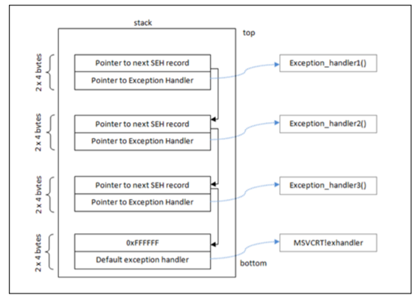 윈도우에서는 기본적으로 예외들을 처리할 수 있는 SEH를 가지고 있다. OS 수준에서 동작하게 되는 SEH는 최후의 수단으로 사용 되어야한다. 어플리케이션이 catch 코드로 이동하기 이전에 예외핸들러의 지시포인터는 스택에 저장되고 따라서 각 예외 핸들러는 고유의 스택 프레임을 가지게 된다. 프레임기반 예외핸들러에 대한정보는 expception_registration 구조체에 저장된다. 이 구조체는 8바이트로 구성되며 다음 expception_registration의 구조체를 가르키는 포인터와 예외 핸들러의 실제 주소를 가르키는 포인터로 각각 4바이트로 구성 되어있다.