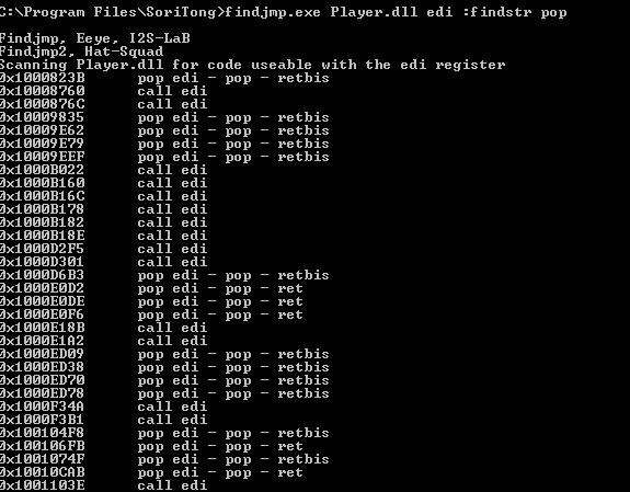 여러종류의 dll중에서 os의 dll이 아닌 것은 player.dll이 유일해보인다. 공격코드의 범용성을 조금더 높이기 위해 해당 dll에서 가젯을 찾아보자. 이번에는 findjmp 프로그램을 이용해 조금 더 간편하게 찾아보았다.
