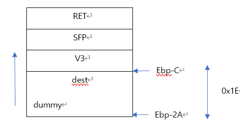 여기서 dest는 ebp-2A위치에 v3는 ebp-C에 위치하는 것을 확인 할 수 있다. dest와 v3 사이의 거리를 계산 해보면 0x1E임을 확인 할 수 있는데 정작 strncpy함수가 복사해주는 길이는 0x1F이므로 1byte만큼 차이가 존재하는 것을 확인 할 수 있다. 따라서 dest에 dummy*30 + 0xD8을 넣을 수 있다면 문제가 성공적으로 해결 될 것이다.